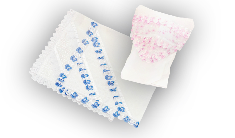 Вышитая ткань-Турция; основа ситец отбеленый, отделка широким шитьем, атласной лентой, бантом,размер 80*80 модель М-102/1