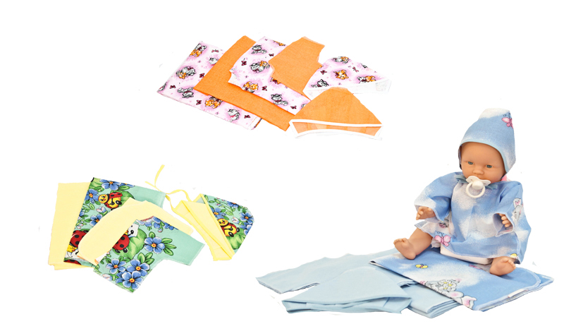 Набор 6-ти предметный, фланель и ситец белоземельные-Шуя, набивной,гладкокрашенный; 1. пеленка ситец размер 80*110 молель М-01, 2. пелёнка фланелевая размер 75*110 модель М-02, 3. чепчик бязь под бейку размер 40 модель М-84, 4. чепчик фланелевый под бейку размер 40 модель М-85, 5. распашонка ситец размер 62-40 модель М-30, 6. распашонка фланелевая размер 62-40 модель М-21.