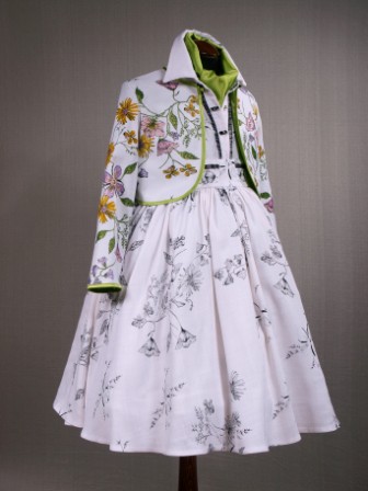 Костюм от кутюр. О таком мечтают даже взрослые модницы. Бело-черное платье из вискозы - просто собрание изысканных деталей. Это и американская пройма, и воротник на стойке, и нежнейший капроновый рюш, и пуговицы со стразами и карманы «в рамку» на широком поясе, и юбка-солнце, и застежка в боку на кнопки… А жакет на подкладке из атласа фисташкового цвета, с великолепной ручной росписью делают костюм просто неповторимым.