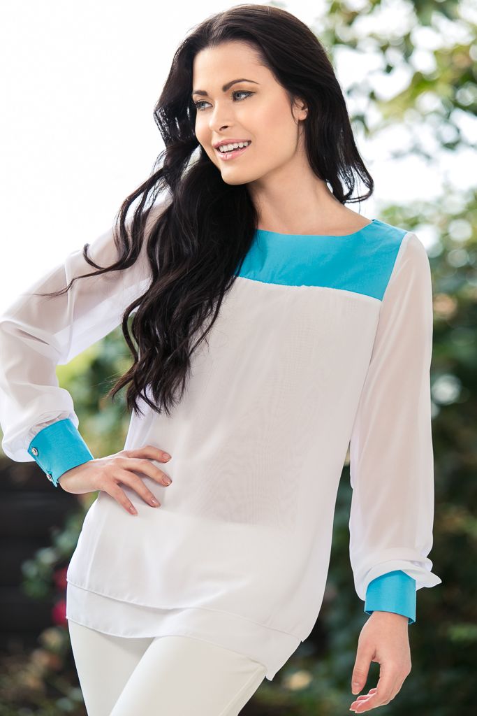 Яркая модная блуза стильного прямого покроя. Блуза изготовлена из нарядного шифона в сочетании с хлопковыми вставками, спереди блузы двойной слой шифона. На манжетах украшена нарядными пуговицами-стразами. Длина блузки по спинке - 65 см. Длина рукава с манжетом - 66 см.