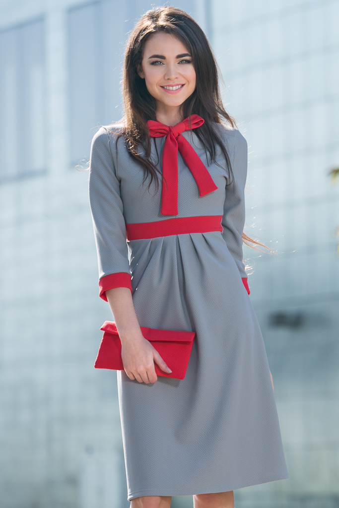 Эффектное, нарядное трикотажное платье, с завышенной талией. Эта модель, за счет своего покроя, идеально ляжет на любую фигуру и хорошо скроет мелкие недостатки. Воротник выполнен в виде банта. Выполнено из плотного трикотажа с легким утягивающим эффектом, очень приятного к телу. Состав ткани: 45 % хлопок, 50 % вискоза, 5 % эластан. Длина платья по спинке - 95 см. Длина рукава - 39 см.