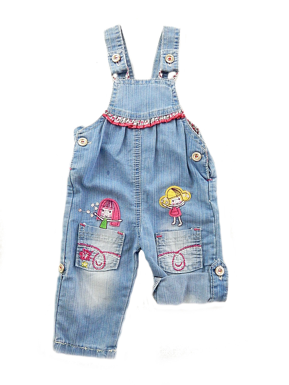 Комбинезон-шорты с двумя карманами , застегивается на лямках и по бокам на пуговицы, длинна брючин регулируется. Украшен вышивкой.