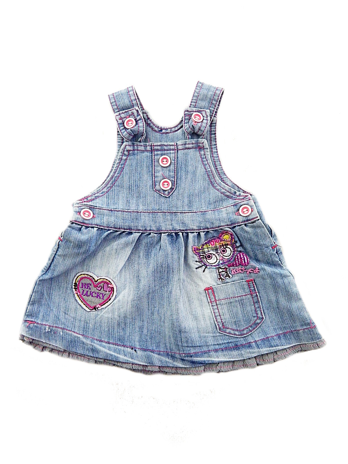 Сарафан с одним карманом, застегивается на лямках и по бокам на пуговицы. Украшен вышивкой.