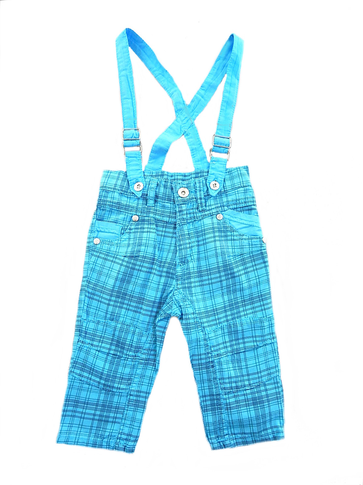 Брюки на лямках, с пятью карманами, застежка на пуговицу и молнию. Лямки на пуговицах и регулируются.