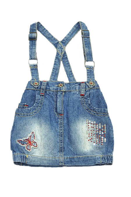 Юбка с двумя карманами на лямках. Юбка застегивается на пуговицу и молнию, лямки на пуговицах. Украшена вышивкой и паетками.