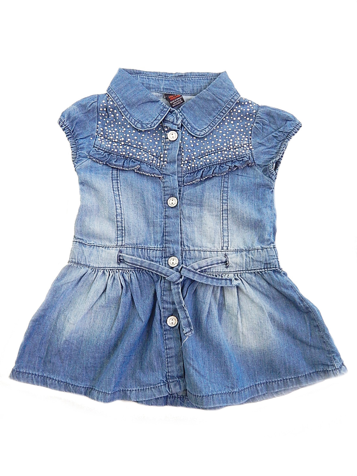 Платье на пуговицах, пояс на завязке. Украшено паетками.