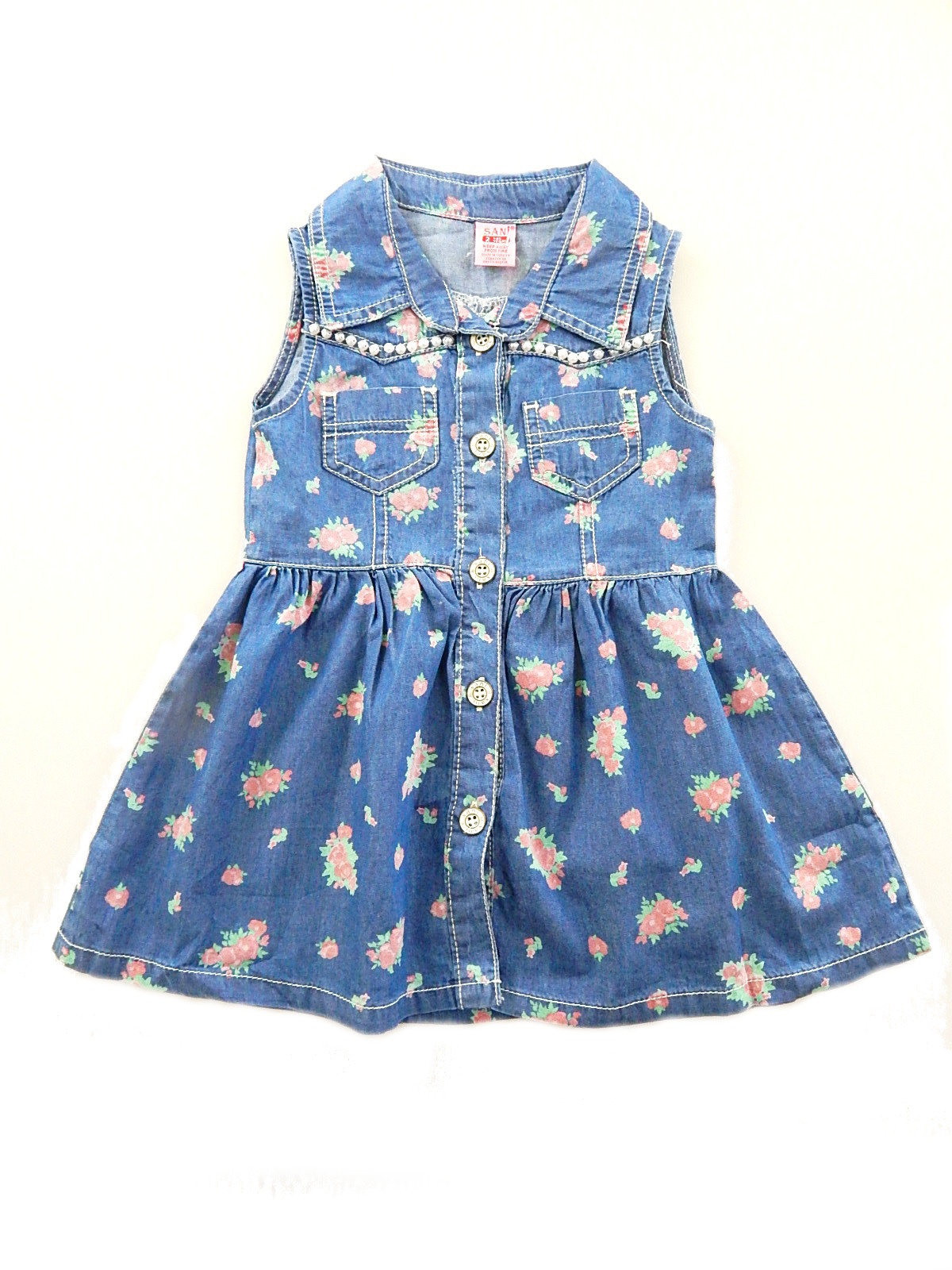 Сарафан на пуговицах, с двумя карманами. Украшен бусинами.