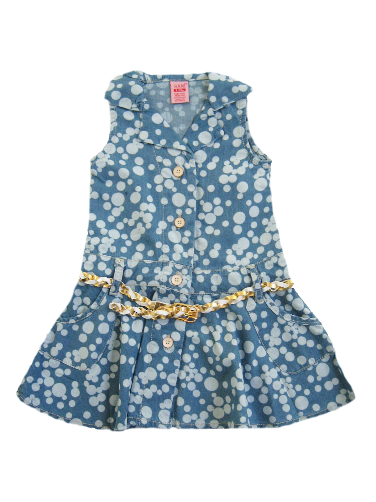 Платье без рукавов с заниженной талией, застежка на пуговицы с ремешком.