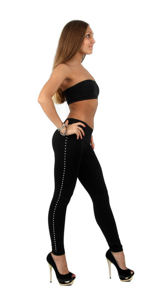 Главный тренд этого сезона это леггинсы, украшенные небольшими блестящими клепками сбоку.подчёркивающие тонкость щиколоток и стройность ног.