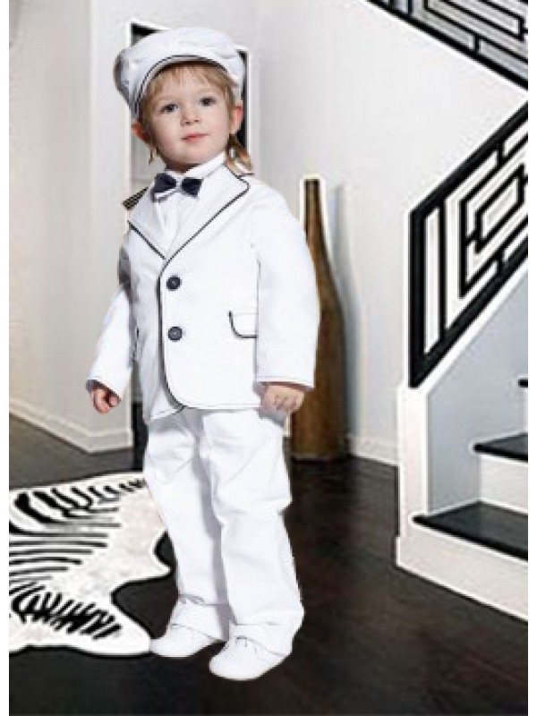 Костюм для мальчика из белого,хлопкового вельветона,отделан темной тесьмой,также в состав комплекта входит рубашка,галстук бабочка и кепка.Костюм очаровательный,обладает волшебным шармом ,присущим белому цвету.