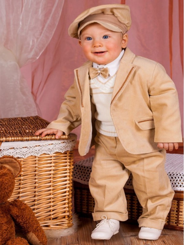 Костюм простой,классический,пиджак отделан вставками из искусственной замши на тон темнее чем сам пиджак,пиджак двубортный,брюки широкие ,маленькие размеры скроены на памперс имитация гульфика,пояс на широкой резинке,хлопковая рубашка,галстук-бабочка,вельветовая кепка на рибане,жилет из акрила,довольно тонкий