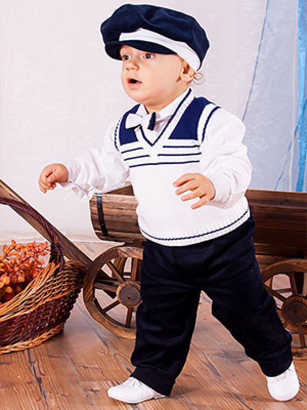 С виду простой,без претензий комплект для мальчика,состоит из вязанного жилета,однотонных вельветовых брюк,хлопковой рубшки с широким рукавом на манжете.Комплект дополняют галстук-бабочка двойной подходящий по цвету к брюкам и к кепке