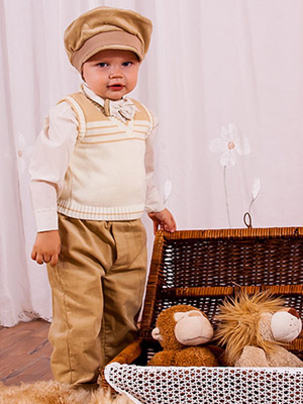 С виду простой,без претензий комплект для мальчика,состоит из вязанного жилета,однотонных вельветовых брюк,хлопковой рубшки с широким рукавом на манжете.Комплект дополняют галстук-бабочка двойной подходящий по цвету к брюкам и к кепке