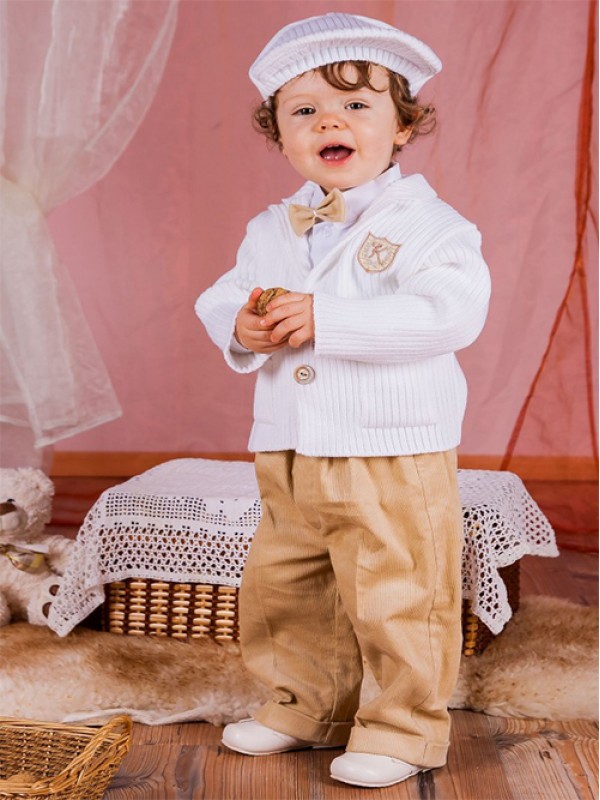 Славный,весенний комплект, с плотным кардиганом связанным лапшой,круглыми стилизованными пуговицами,хлопковой рубашкой,брюками слаксами из вельвета и милым беретиком с кокардкой.Конечно же и галстук бабочка.Отличный комплект для межсезонья -поздней весны или ранней осени