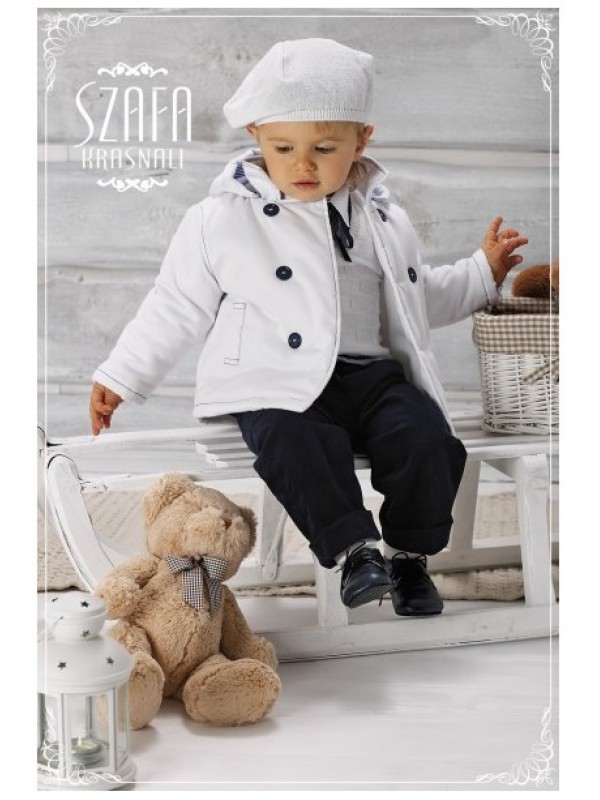 Утепленный комплект для мальчика включает в себя акриловый пулловер белого цвета с темно синим кантом V образной горловиной,хлопковая рубашка,вельветовые брюки,утепленную куртку белого или бежевого цвета,вязанная шапочка из акрила.
