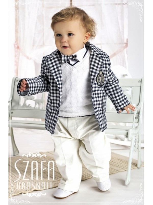 стильный,клубный пиджак в клетку из хлопка на подкладе, на рукавах пиджака стилизованные заплатки белого либо синего цвета,деликатный,тонкий жилет с рисунком "ромбы",спортивного кроя хлопковую рубашку.Брюки из хлопка