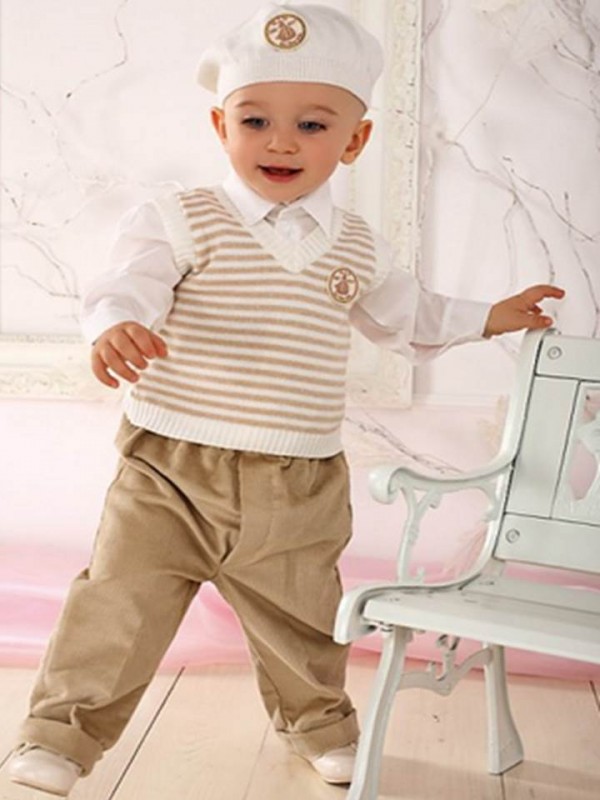 Костюм включает в себя:жилет в мелкую бело-синюю полску, брюки ,хлопковую рубашку с регулируемой длиной рукава и трикотажную белую шапочку