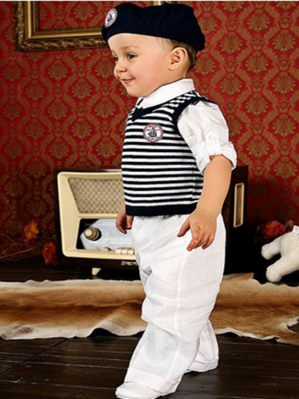 Костюм включает в себя:жилет в мелкую бело-синюю полску, брюки ,хлопковую рубашку с регулируемой длиной рукава и трикотажную белую шапочку