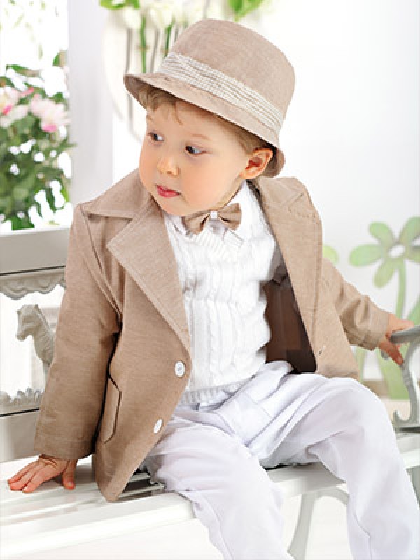 Элегантный костюм для лета,тонкий пиджак из хлопка,легкие хлопковые брюки,рубашка с регулируемой длинной рукава из 100% хлопка.Галстук-бабочка тонкий вязаный жилет из акрила связан кубиками.На пиджаке,немаловажная деталь присутствует нагрудный карман для платочка или бутоньерки