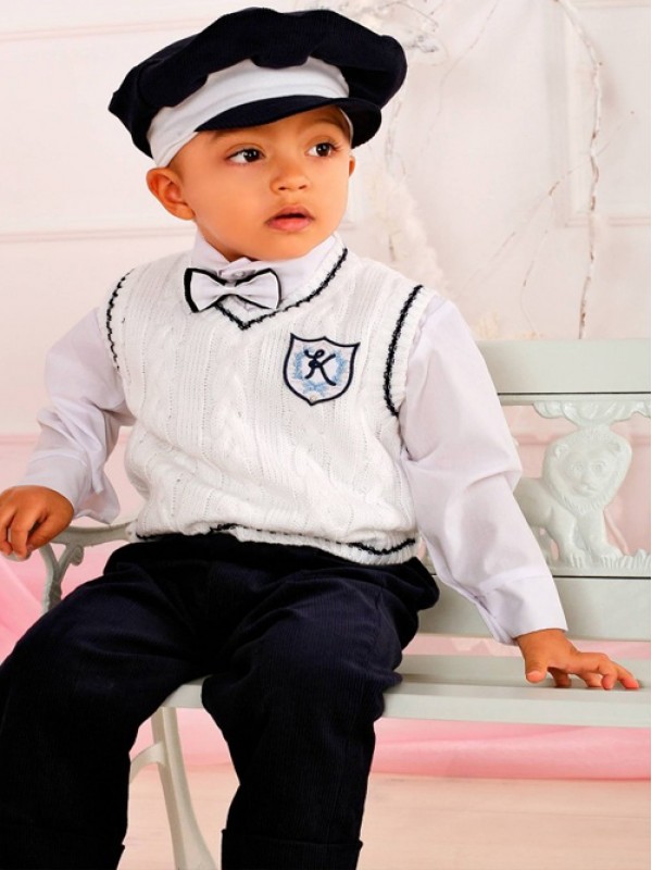 комплект состоит из опикованного синим трикотажем жилета,состав 30%хлопок,70%акрил,хлопковой рубашки и вельветовых брюк с отворотом,дополняет костюм кепка из вельвета,галстук бабочка и в тон эмблема клуба на жилете