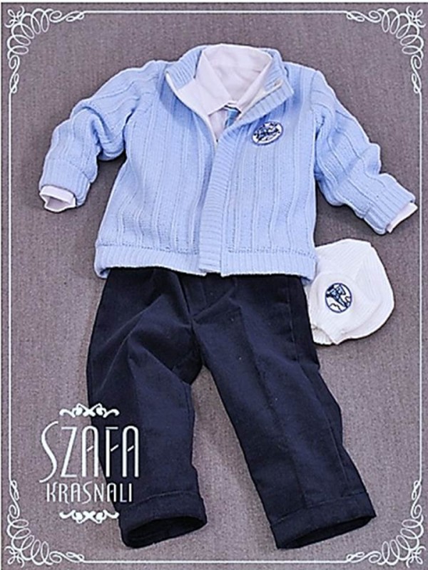Костюм с теплой,вязанной курткой,на подкладе из вельсофта,курта связана в косичку на замке,украшена эмблемой клуба,дополняют костюм вельветовые брюки,хлопковая рубашка и галстук-бабочка.Маленькие размеры до 86 включительно комплектуются трикотажной шапочкой.В больших размерах шапочек нет.Костюм очень функциональный,комбинаторный,можно носить куртку отдельно,стоит лишь подобрат цвет