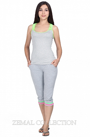 Костюм для спорта и отдыха. Вискозная майка декорирована вставкой из яркого гипюра. Трикотажные бриджи с функциональными карманами и резинкой на талии. Нижние манжеты с яркими цветными полосами в тон отделки майки.