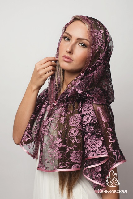 Платок отличается неповторимым по своей красоте художественным решением. Пышный цветочный орнамент четко выступает на прозрачном фоне, что придает торжественность и роскошь узору. Отделанное бисером кружево красиво обрамляет лицо и помогает создать изысканный образ, а пуговица-кристалл Swarovski добавляет облику блеска и роскоши. Благородный цвет <<вишневой пенки>> как нельзя лучше подчеркивает всю уникальность изделия.