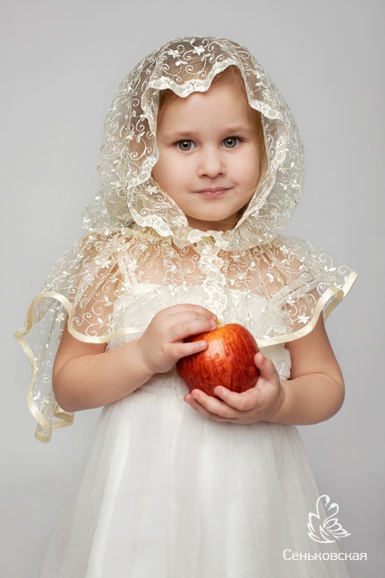 Сказочный платок не оставит равнодушной ни одну юную красавицу. Можете быть уверены, в таком нарядном платке Ваше чадо будет с удовольствием посещать храм. Нежный цветочный узор на ажурной сетке, благородный молочный цвет и изысканное кружево, обрамляющее лицо, создают очаровательный и необычайно красивый образ. Косая бейка в тон подчеркивает воздушность платка, а пуговица-кристалл Swarovski делает его нарядным и изысканным.
