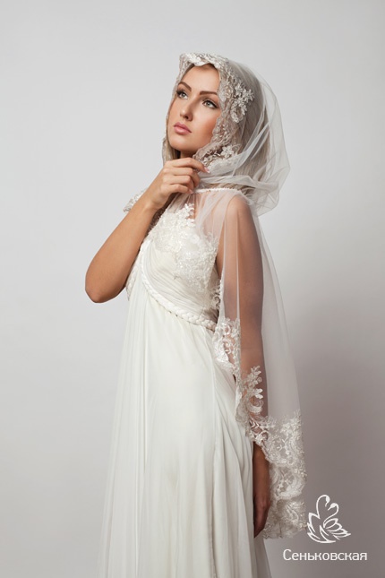 Это платок для невесты, ценящей стиль, элегантность и знающей последние тенденции в моде. Он поможет создать невероятно легкий и летящий образ, подчеркнув Вашу женственность и изящество. Воздушность облику придает прозрачная французская сетка молочного цвета, украшенная по краям великолепным кружевом с цветочным узором. Вся ткань усыпана стразами, бисером и пайетками, благодаря чему платок будет красиво мерцать и переливаться в мягком освещении храма.