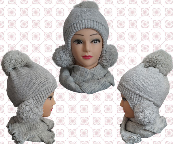 Комплект: Шарф и шапочка подростковая для девочки, с бубонами, "Снежинка".Цвет:серый.Состав:60% шерсть, 40% акрил.Размер: 55.