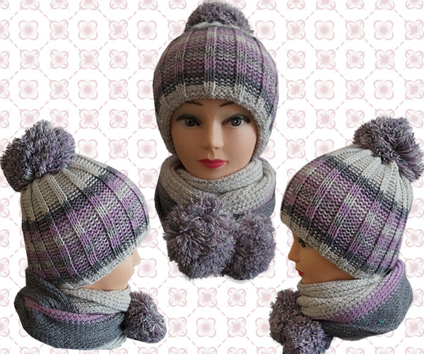Комплект:Шарф и шапочка подростковая для девочки, с бубонами.Цвет:серый, сиреневый.Состав:60% шерсть, 40% акрил.Размер: 55.