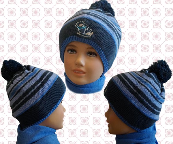 Комплект для мальчика: шапочка и шарф.Шапочка двойная,плотной вязки. Цвет:синий. Состав: 60% шерсть, 40% акрил.Размер: 55