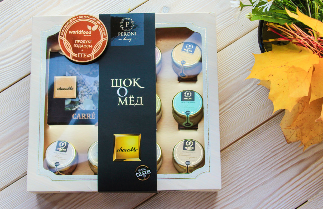Уникальный подарочный набор из 8 баночек мёда, по вкусу специально подобранных к плитке шоколада Choco Me - победителю европейского конкурса Great Taste of World 2013.