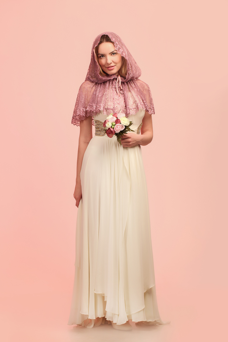 Отделка: Кружево вышивка на фатине шелковой нитью в цвет ткани. Кружево расположено по краю изделия со всех сторон.