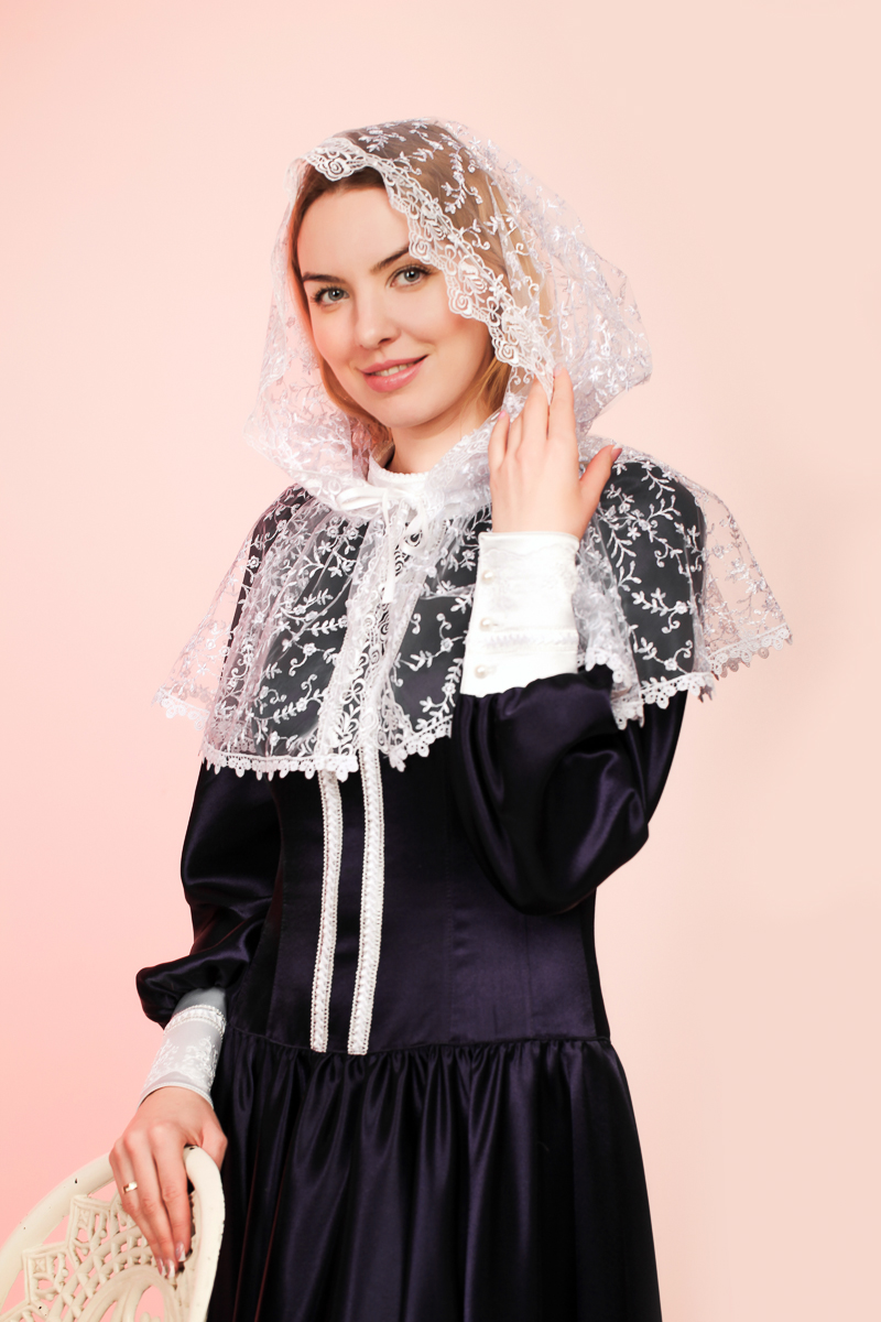 Отделка: Кружево вышивка шелковой нитью на фатине в цвет основной ткани. Кружево расположено по краю изделия со всех сторон