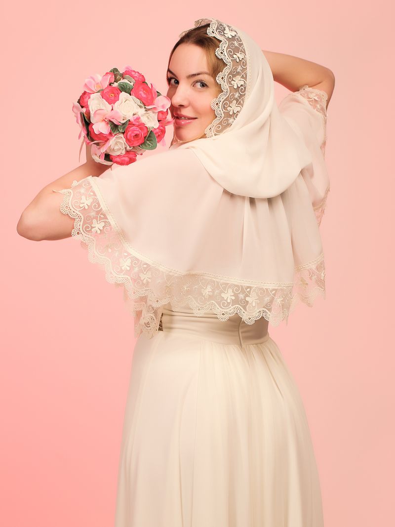 Отделка: Кружево вышивка на фатине шелковой нитью молочного цвета. Кружево расположено по краю изделия со всех сторон.