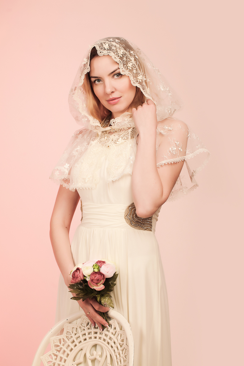 Отделка: Кружево вышивка шелковой нитью на фатине в цвет основной ткани. Кружево расположено по краю изделия со всех сторон