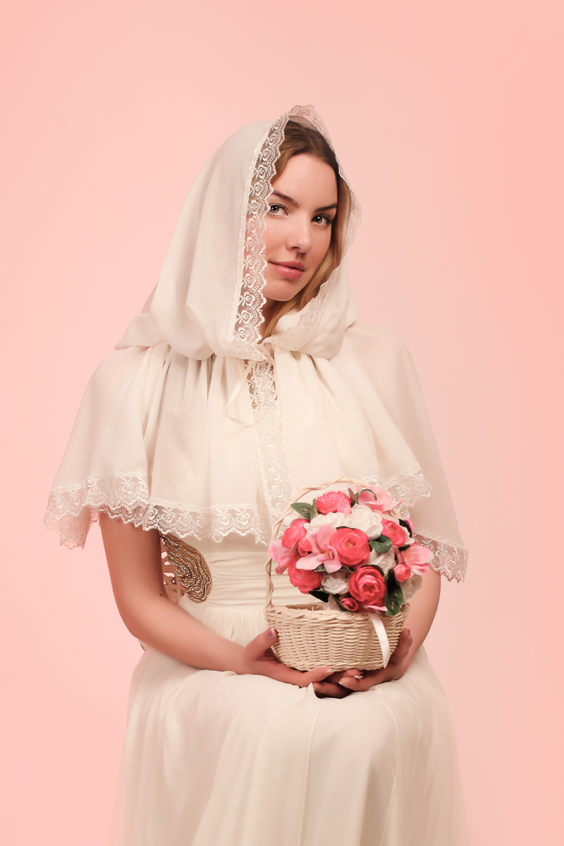 Отделка: Кружево вышивка на фатине шелковой нитью в цвет ткани. Кружево расположено по краю изделия со всех сторон.