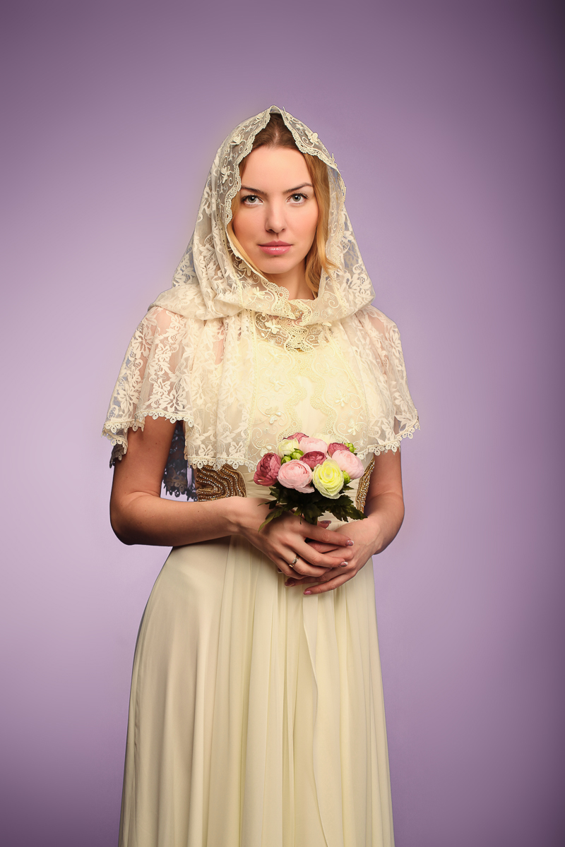 Отделка: Кружево вышивка на сетке шелковой нитью молочного цвета. Кружево расположено по краю изделия со всех сторон.