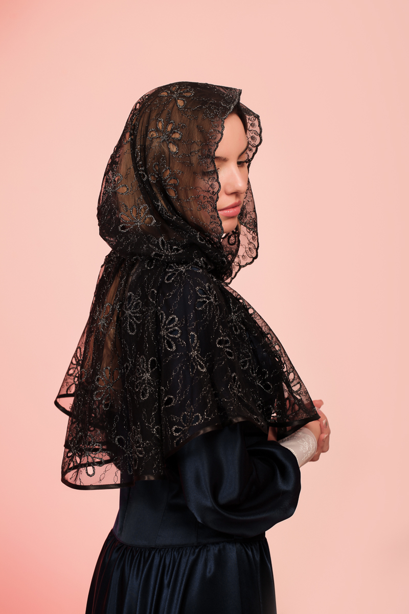 Каймовое кружево расположено возле лица, остальные края изделия обработаны атласной лентой в цвет ткани