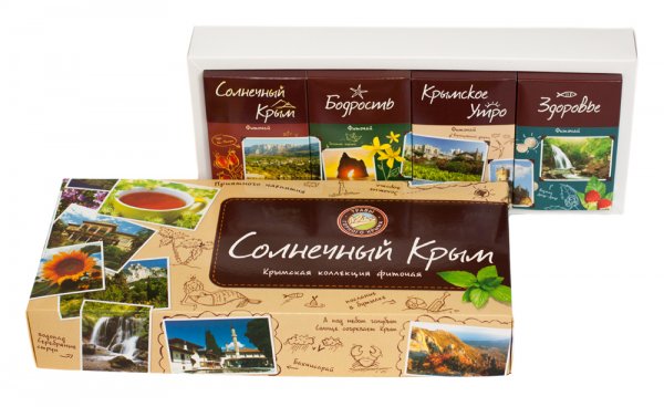 В состав подарочной коробки входят черыре чая из чайной коллекции: " Солнечный Крым", "Бодрость", "Здоровье", "Крымское утро".