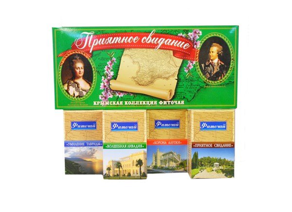 В состав подарочной коробки входят четыре чая из чайной коллекции: "Волшебная Ливадия", "Корона Алупки", "Приятное свидание", "Умиление Тавриды".