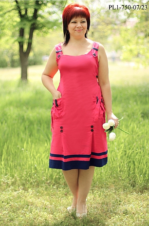Сарафан приталенного силуэта с черной отделкой, декорированный объемными карманами. Широкие бретели продеты в шлевку и зафиксированы пуговицей. По среднему шву спинки потайная молния. Талию подчеркивает пояс.