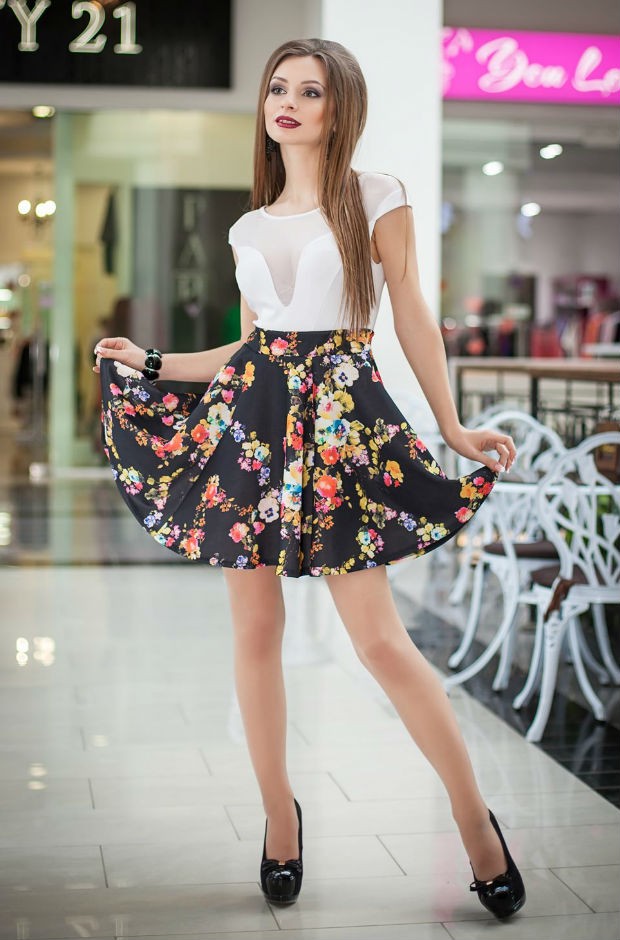 Комбинированное и контрастное приталенное платье срасклешенной принтованной юбкой. Белый обтягивающий верх очень хорошо сочитается с темной и объемной юбкой, которая представлена с двумя принтами: космическим и флористическим. На спине этой модели предусмотрена потайная молния.