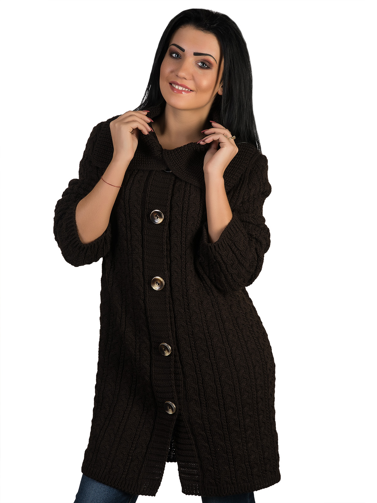 Теплый кардиган прямого силуэта, выполненный рельефной вязкой из качественной пряжи. Изделие с объемным отложным воротником и длинным рукавом. Спереди расположена застежка на пуговицы. Нижний и рукавный манжеты ребристые. Практичная модель, которая отлично сочетается с любыми нарядами!
