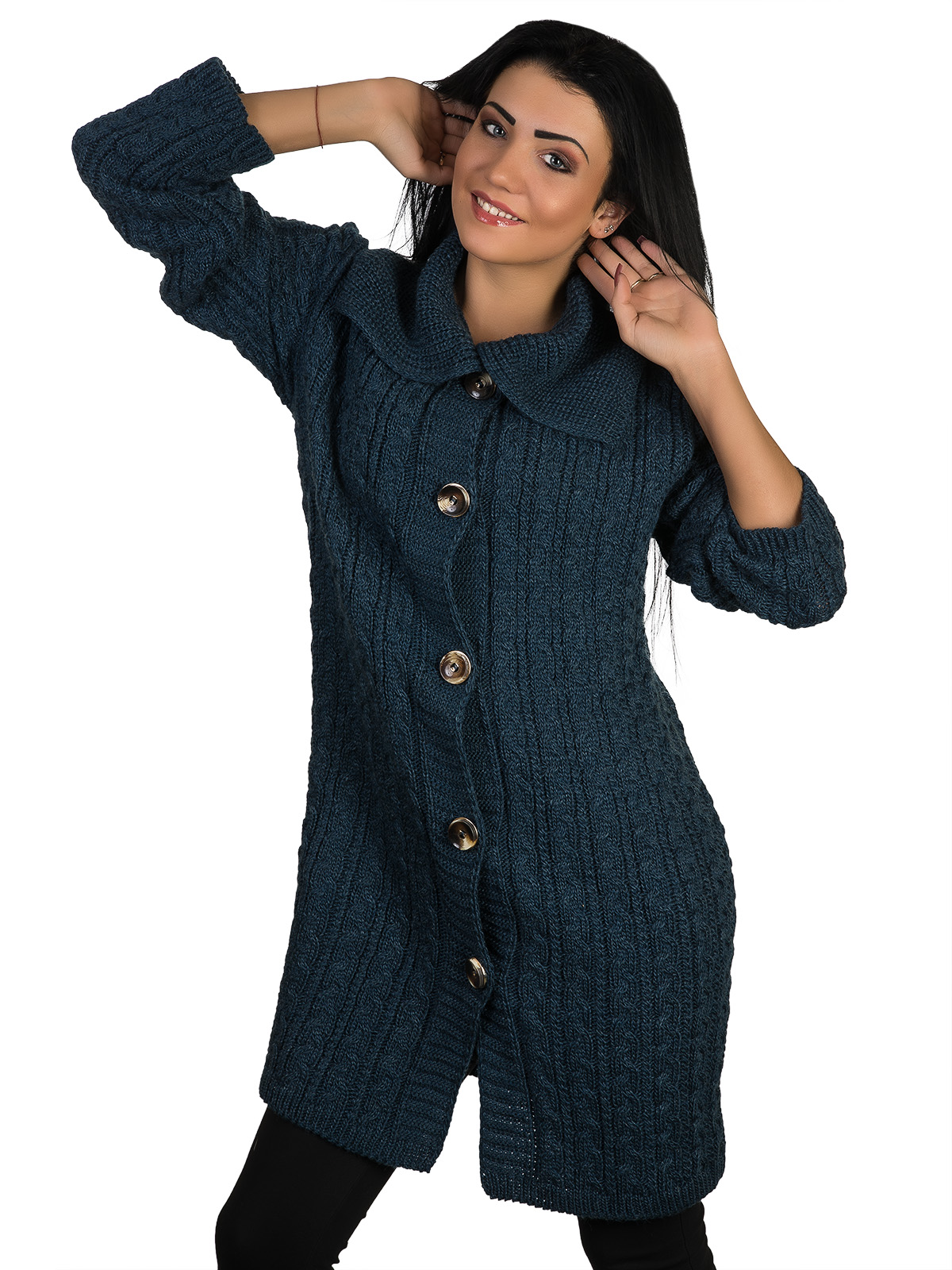 Теплый кардиган прямого силуэта, выполненный рельефной вязкой из качественной пряжи. Изделие с объемным отложным воротником и длинным рукавом. Спереди расположена застежка на пуговицы. Нижний и рукавный манжеты ребристые. Практичная модель, которая отлично сочетается с любыми нарядами!