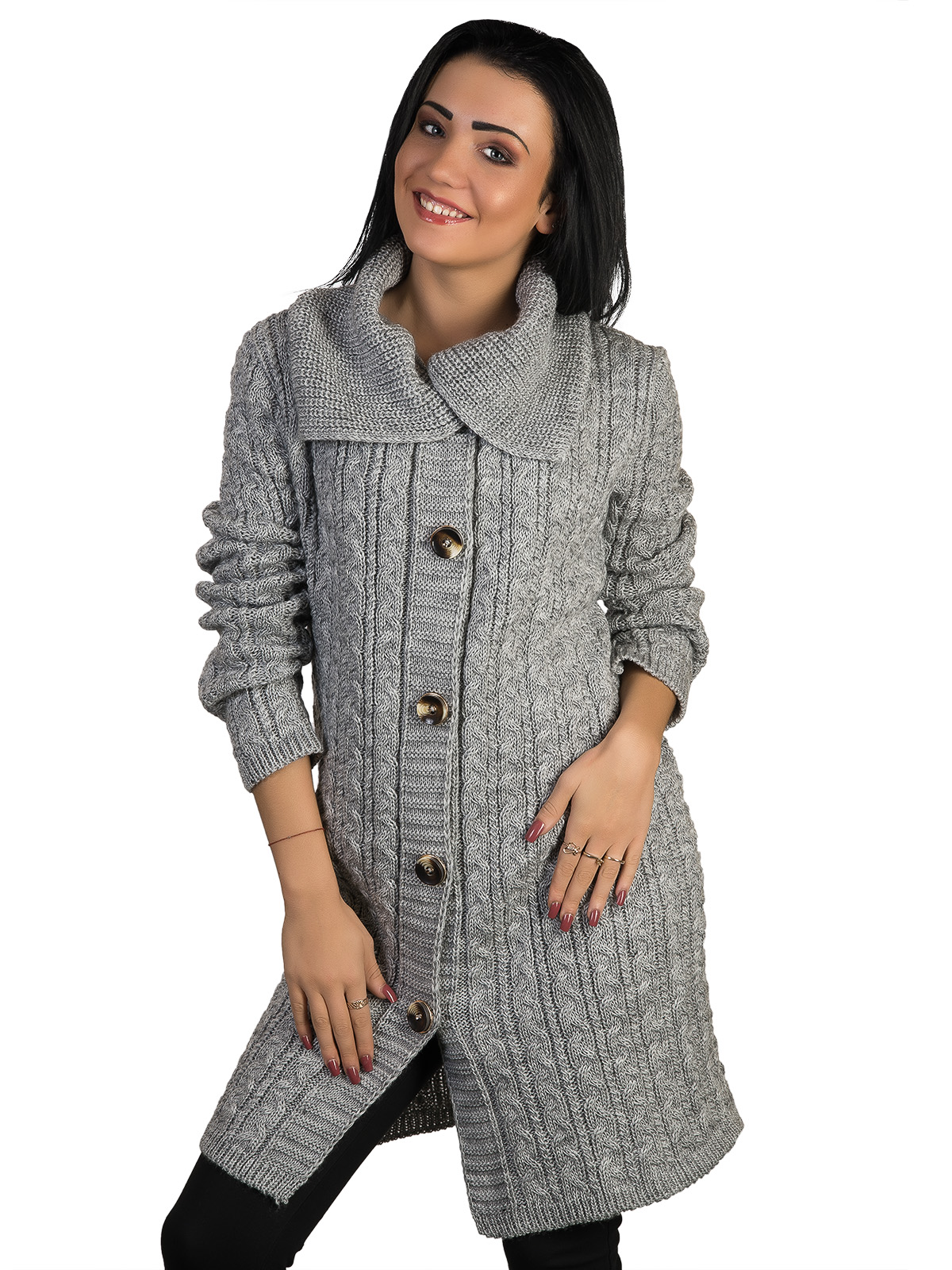 Теплый кардиган прямого силуэта, выполненный рельефной вязкой из качественной пряжи. Изделие с объемным отложным воротником и длинным рукавом. Спереди расположена застежка на пуговицы. Нижний и рукавный манжеты ребристые. Практичная модель, которая отлично сочетается с любыми нарядами!