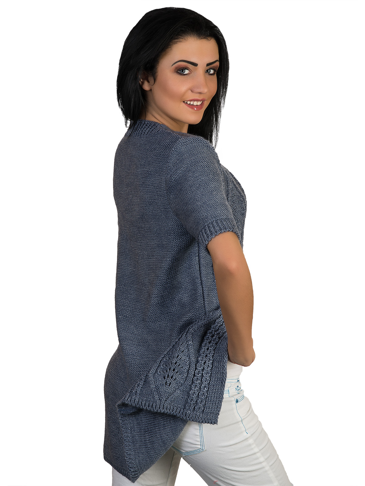Легкий вязанный кардиган прямого силуэта, выполнен оригинальным плетением. Изделие с V-образным вырезом горловины и коротким рукавом. Спереди расположена застежка на три пуговицы. Практичная модель, которая отлично сочетается с любыми нарядами!