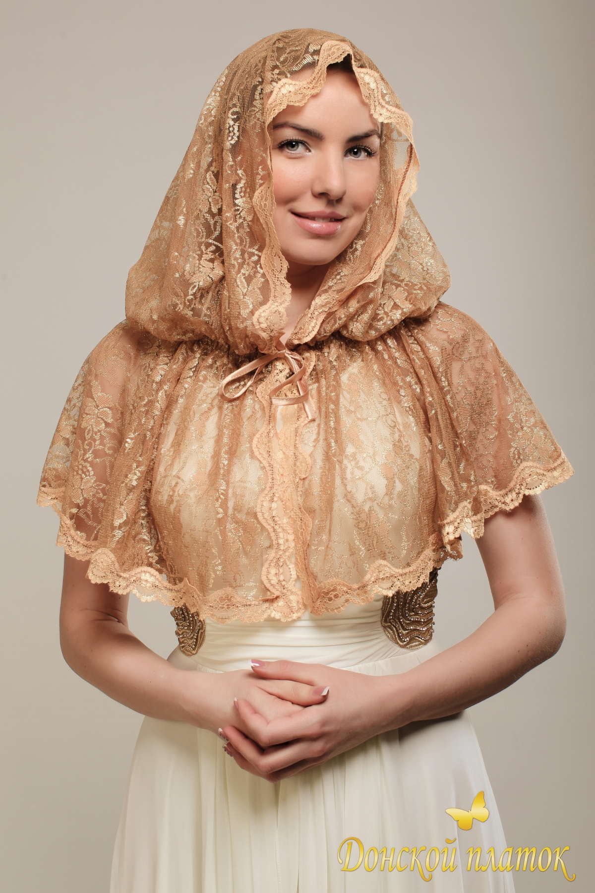 Отличие этой модели в том, что оборка (горжетка) в этой модели закруглена. Завязывается платок впереди на атласные ленты.