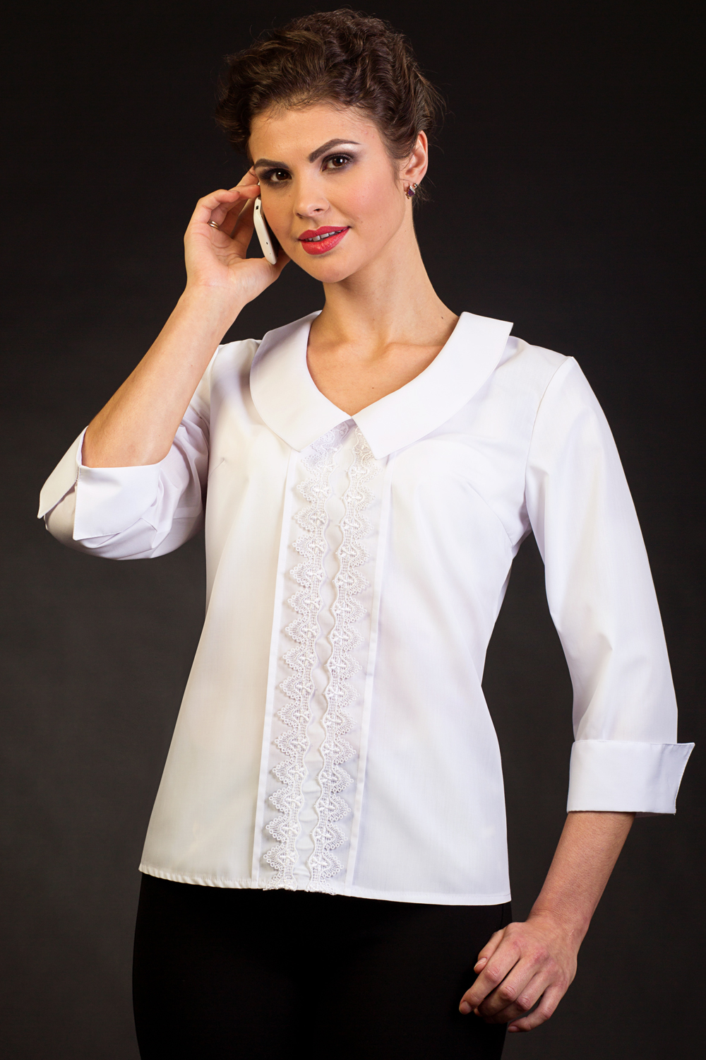 Изысканный V-образный вырез, отложной воротник, застежка по спинке. Все это вместе с отделкой кружевом и декоративными строчками создают нежный, романтичный образ. Ткань: 55% хлопок, 45% ПЭ. Цвет: Белый